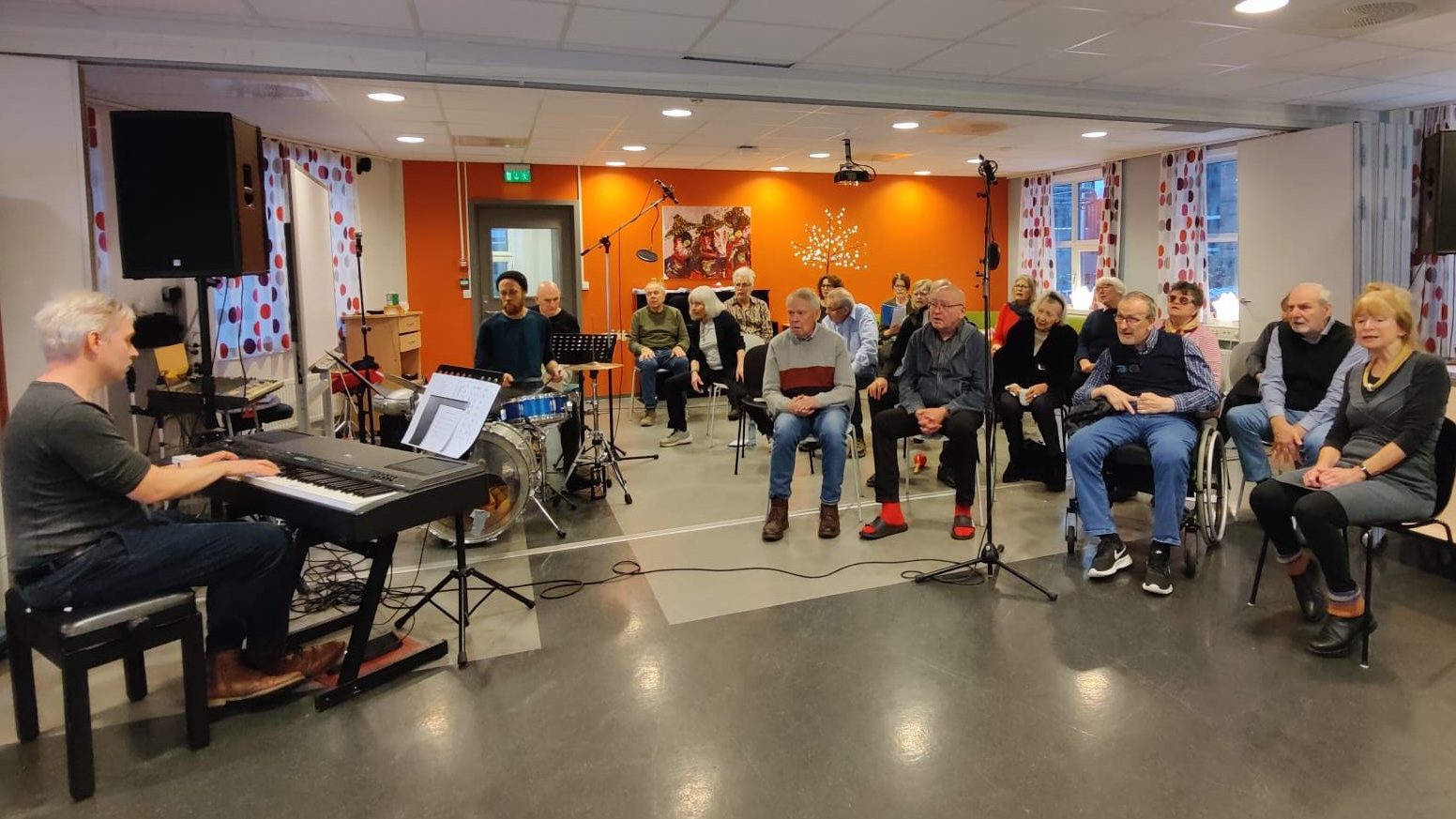 Desember 2021: Vi var heldige som fikk gjennomført julekonserten vår i går i flotte lokaler på Årvoll omsorgssenter, med god avstand og god stemning! Det ble svært vellykket. Takk for 2021, vi sees neste år!!