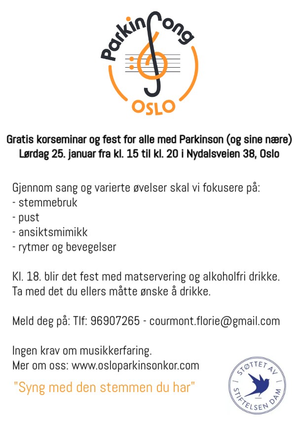 Glad nyhet!! Stiftelsen DAM har valgt å støtte oss enda en gang, og gjør det mulig for alle i Oslo og omegn med parkinson og deres pårørende å delta i to gratis sangseminar i år. Tusen hjertelig takk!!!!